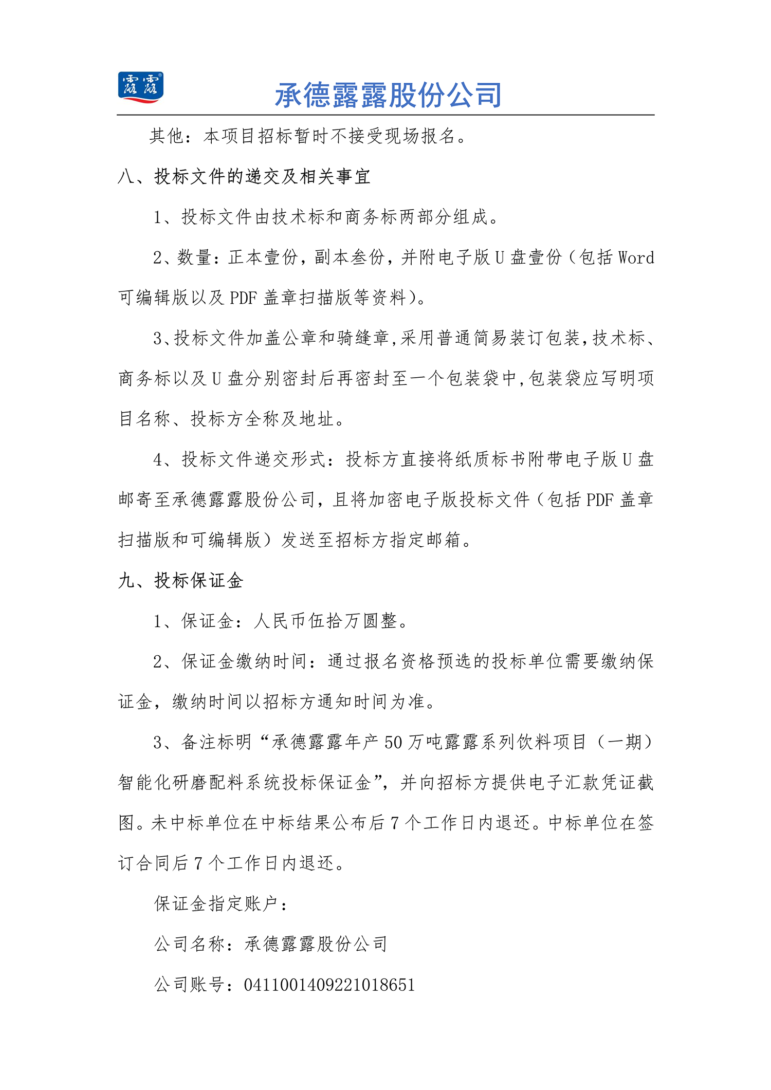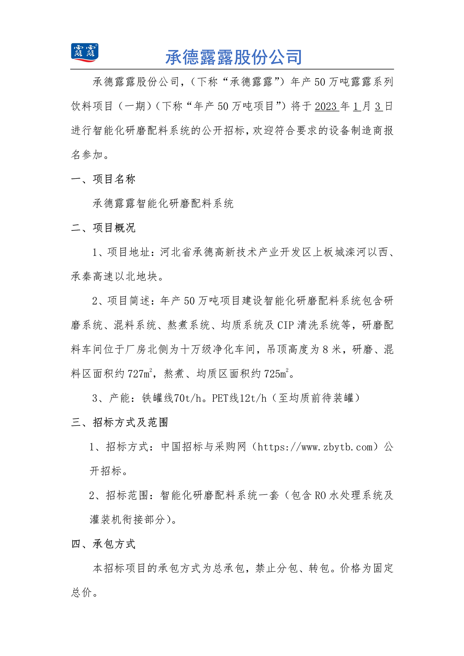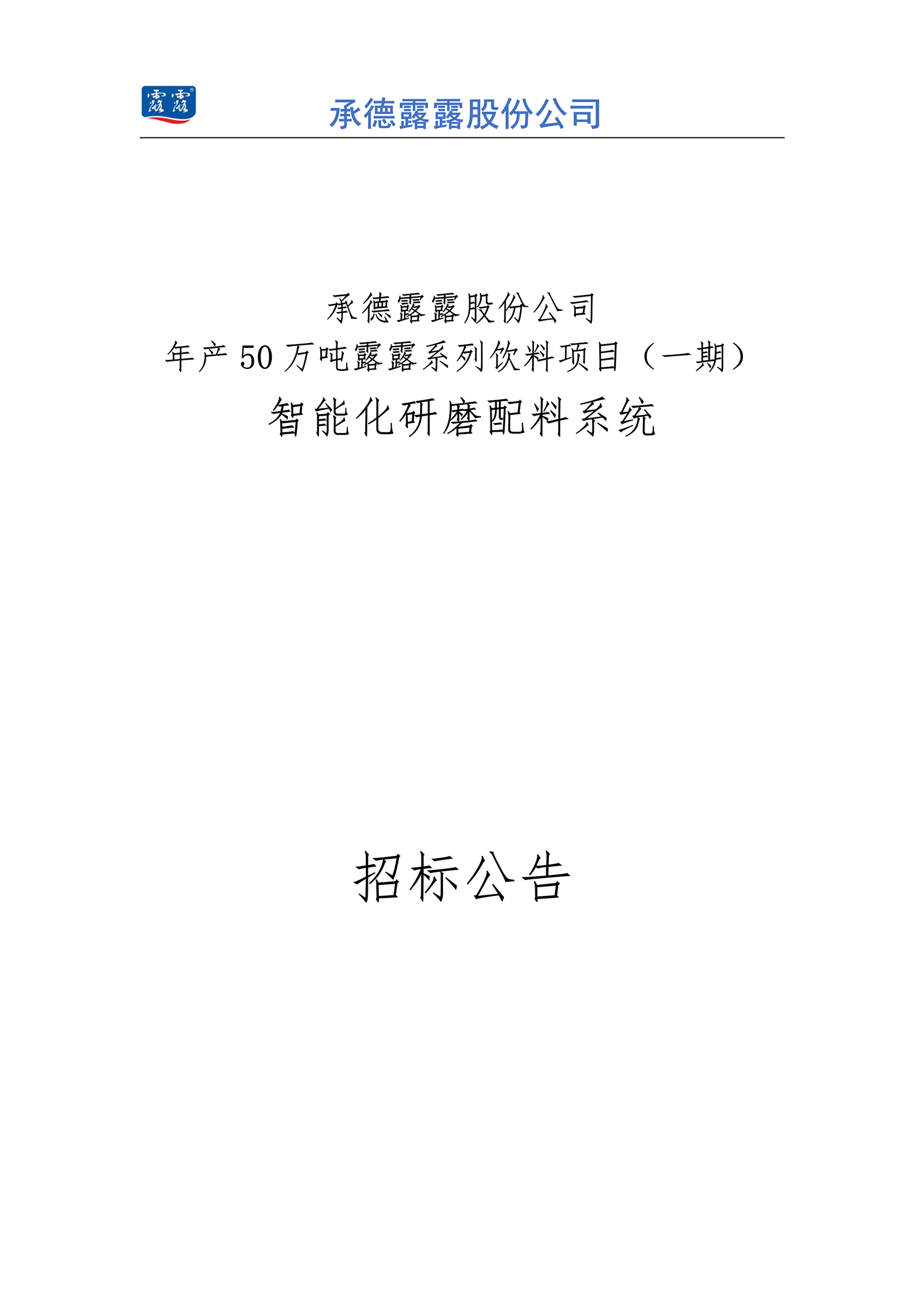 承德露露股份公司 年產 50 萬噸露露系列飲料項目(一期) 智能化研磨配料系統招標公告